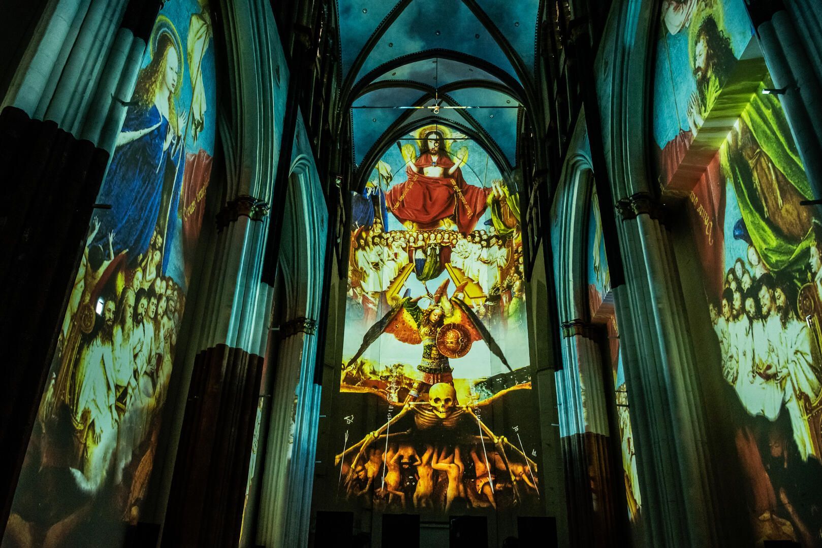 Abbildungen: Der Innenraum von ULRICHLEVIN (3D-Visualisierung Pascal Zufelde) als Projektionsfläche für eine Mulitmediashow über das verlorene Kulturerbe in Magdeburg, Europa und der Welt; Vorbild hierfür die Multimediashow "Lights on van Eyck" in der Genter St. Nikolaus-Kirche (Bildquelle: courtesy of https://www.create.eu)