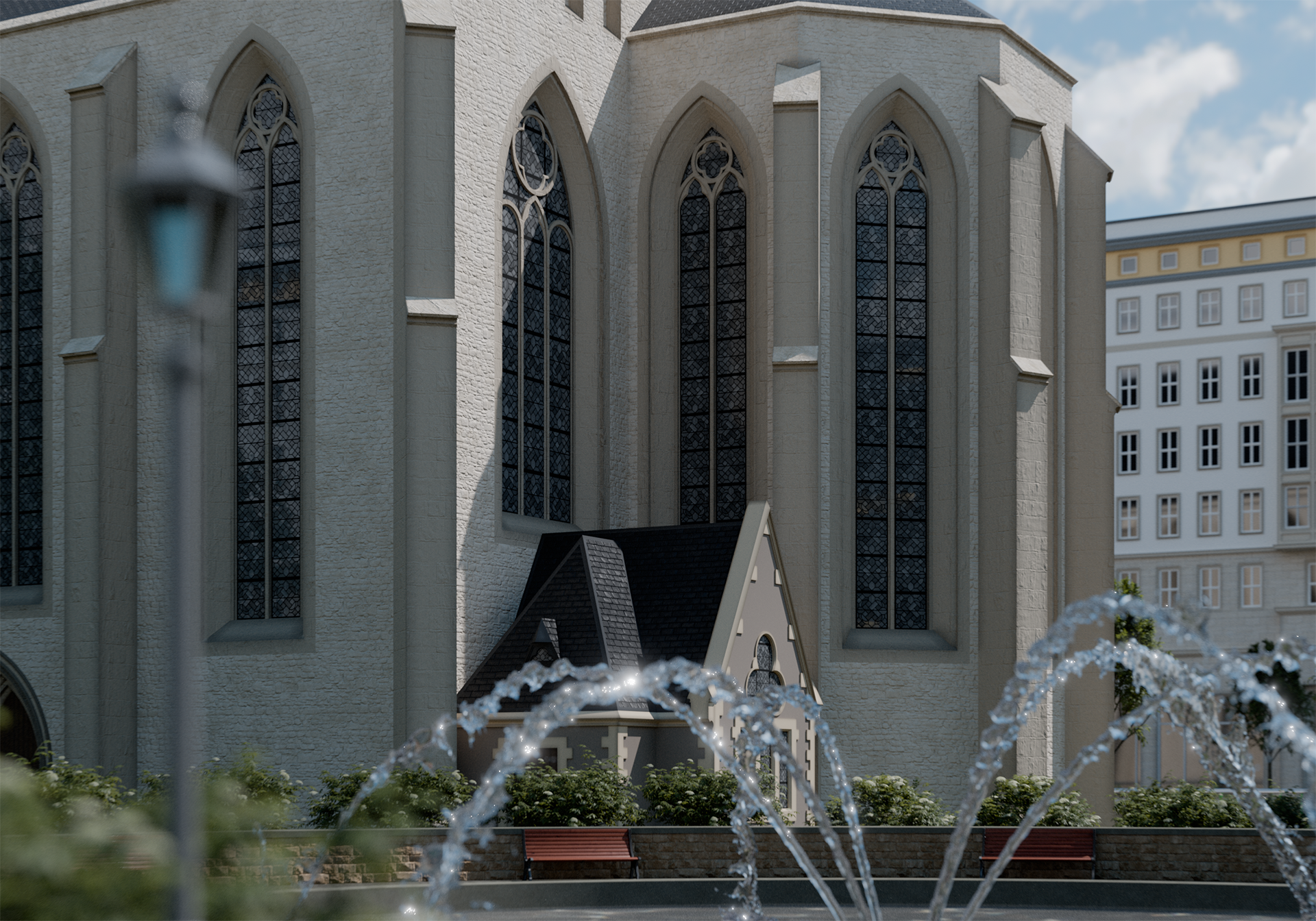 Um eine realistische Vorstellung davon zu geben, wie ULRICHLEVIN auf dem Ulrichplatz wirkt, haben wir eine 360 Grad-Ansicht erstellt. Der 3D-Artist Pascal Zufelde hat hier ein spektakuläres virtuelles Rundherum-Panorama geschaffen, das am PC und am Handy sehr realistisch darstellt, wie der Ulrichplatz heutzutage ausgesehen hätte, wenn St. Ulrich und Levin nicht 1956 in einem Akt der Kulturbarbarei in die Luft gesprengt worden wäre.